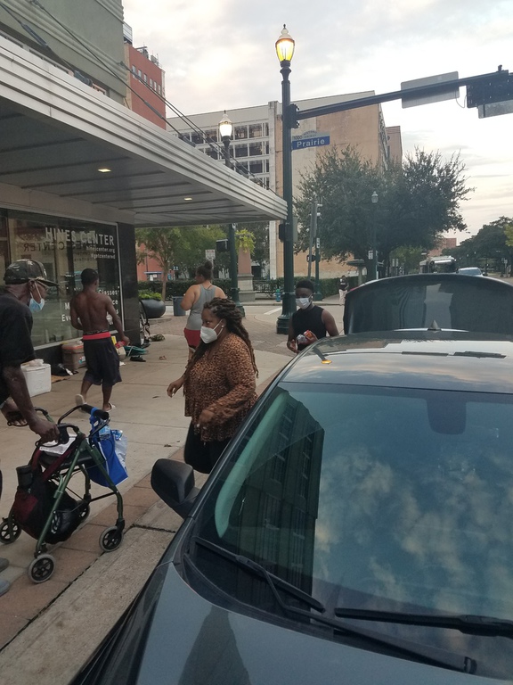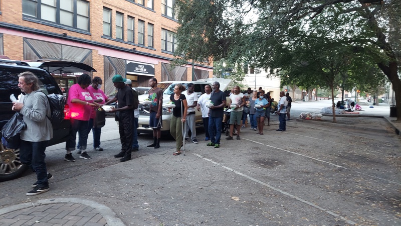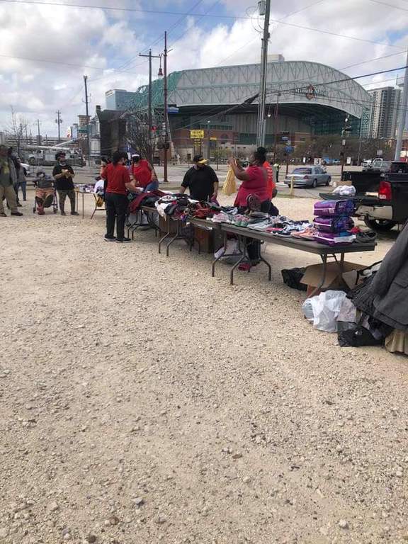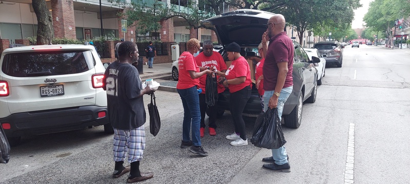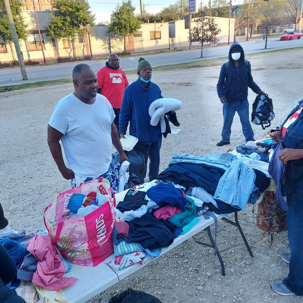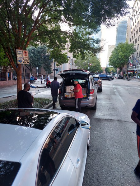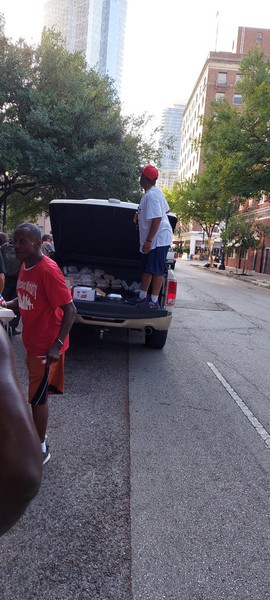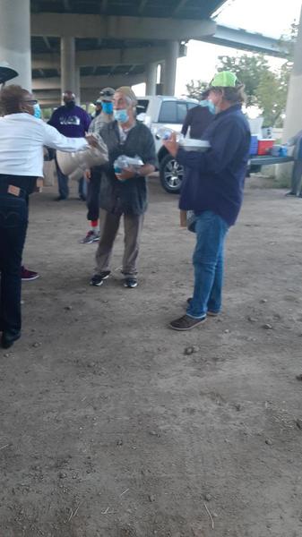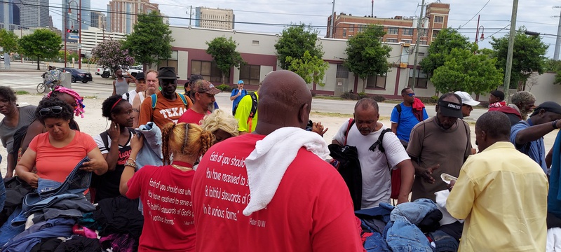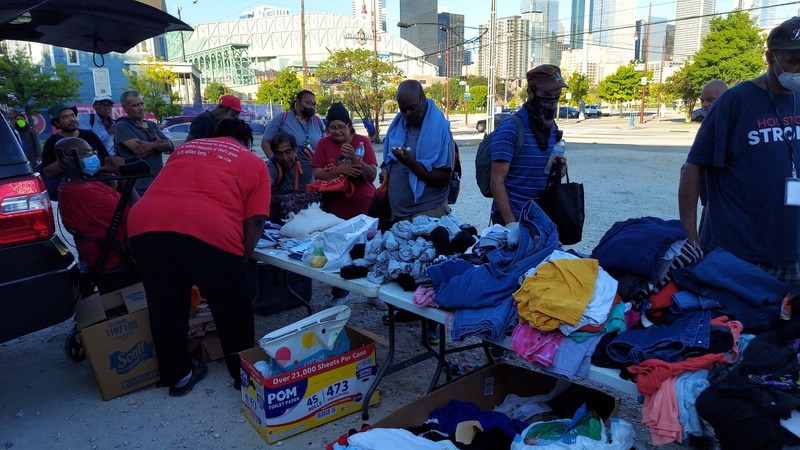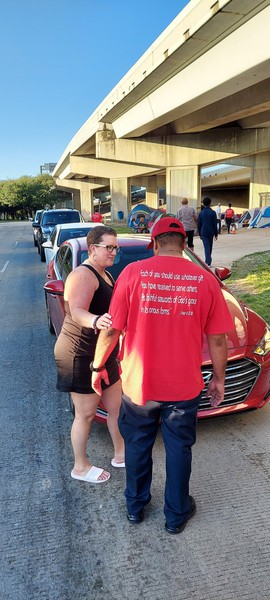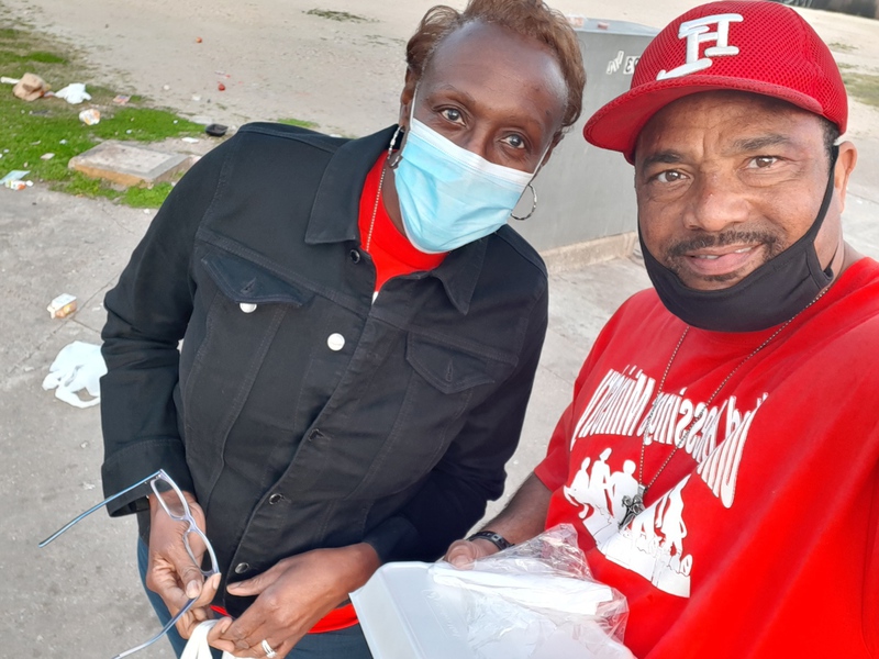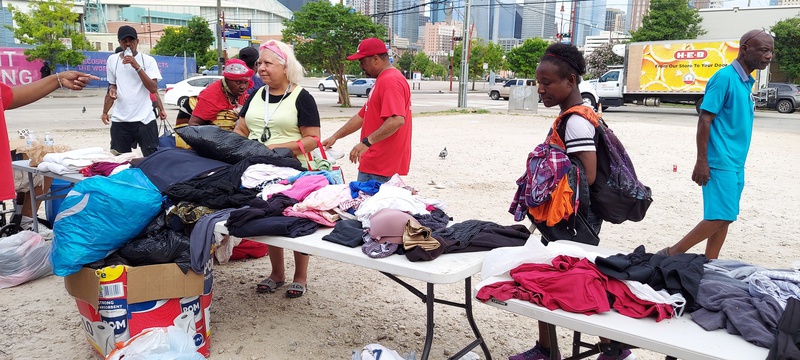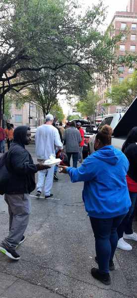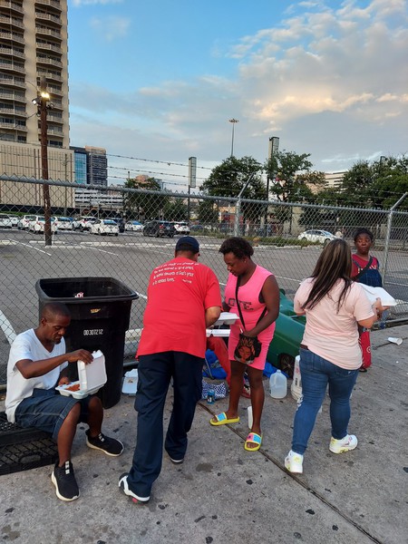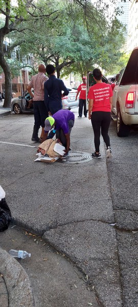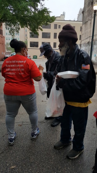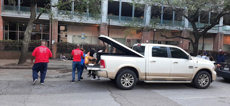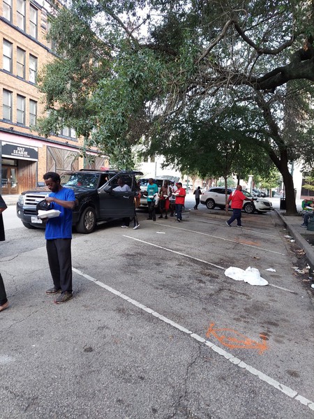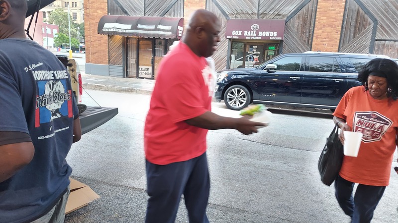 March 13, 2021 - Clothing and Food Drive Downtown Houston providing homemade meatloaf lunch to many.  God blessed many other ministeries to be on the same corner at the same time providing food and the Homeless Depot was providing mobile showers.  Felt just like a festival - True Ministry in Action!  Hallelejuiah.