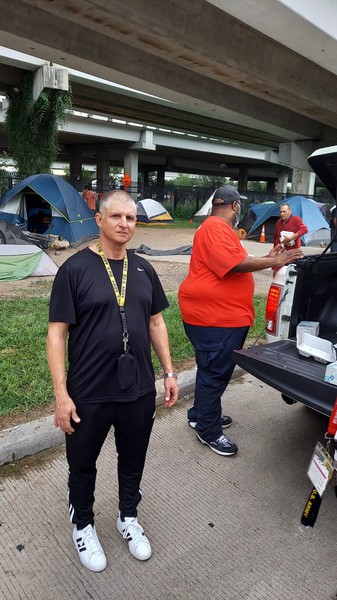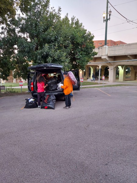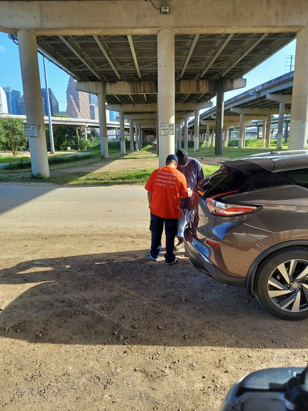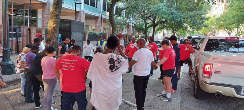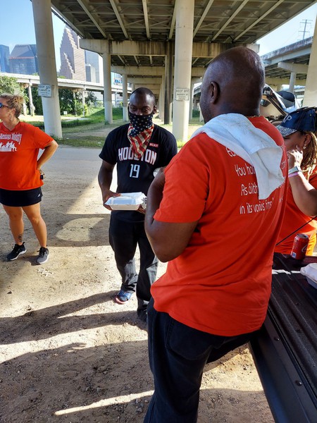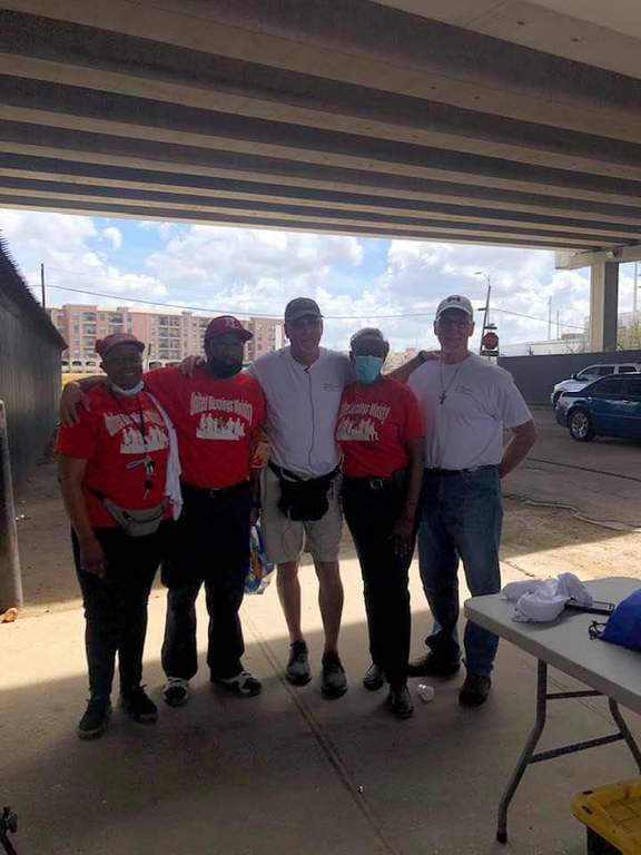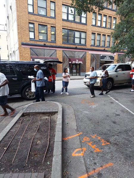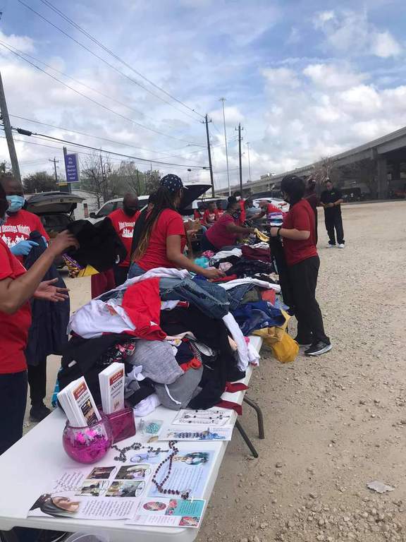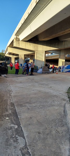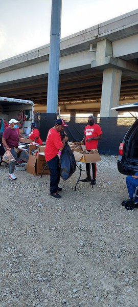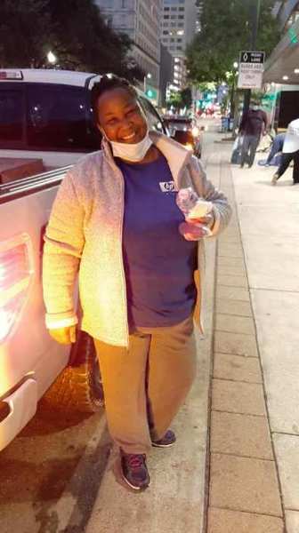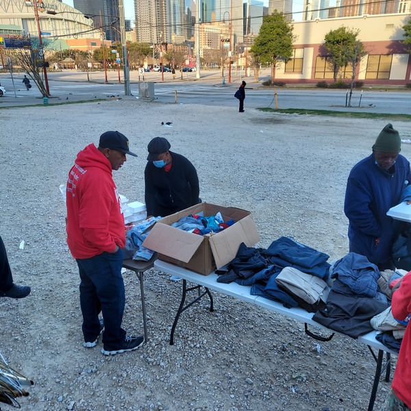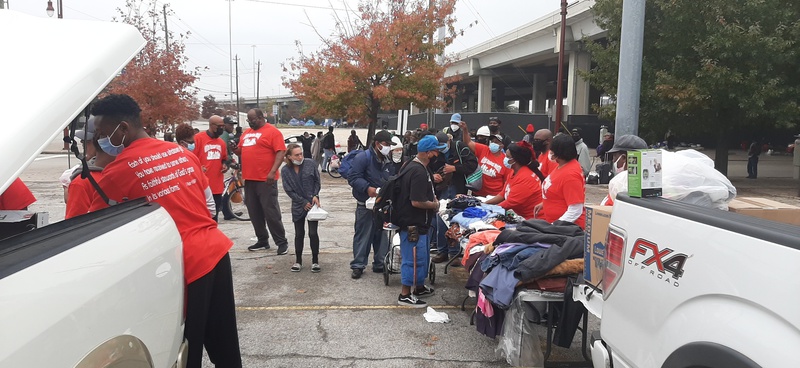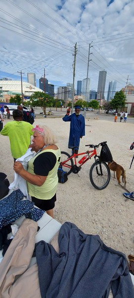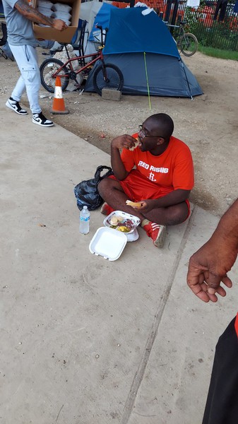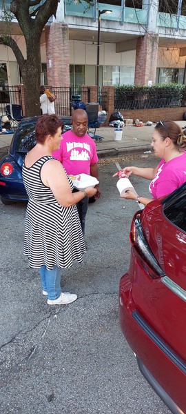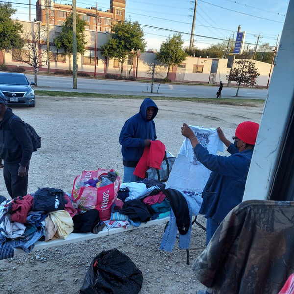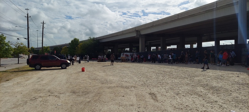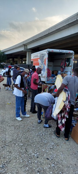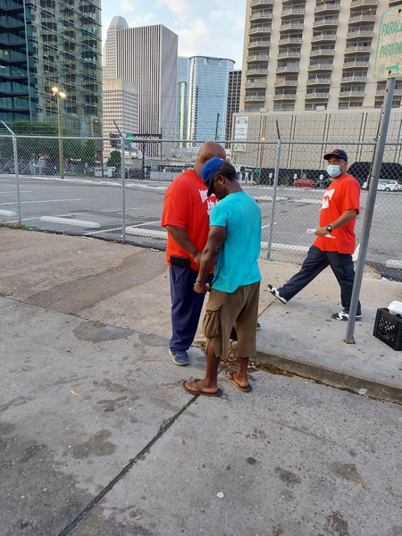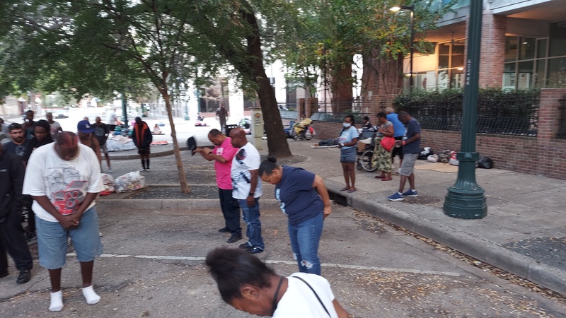 March 13, 2021 - Clothing and Food Drive Downtown Houston providing homemade meatloaf lunch to many.  God blessed many other ministeries to be on the same corner at the same time providing food and the Homeless Depot was providing mobile showers.  Felt just like a festival - True Ministry in Action!  Hallelejuiah.