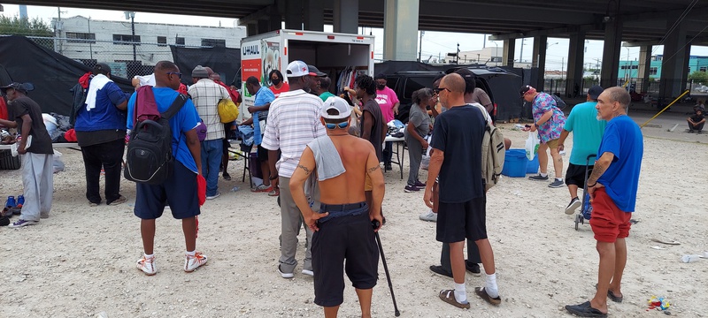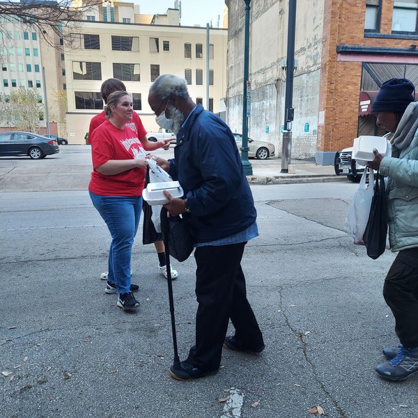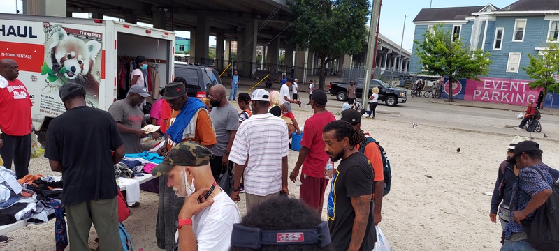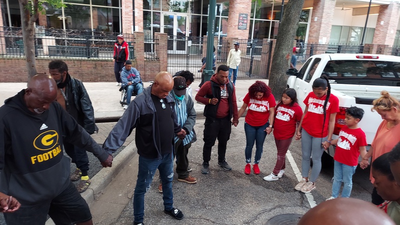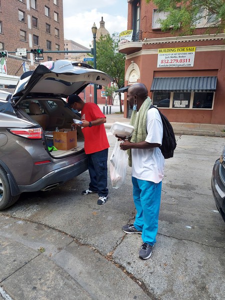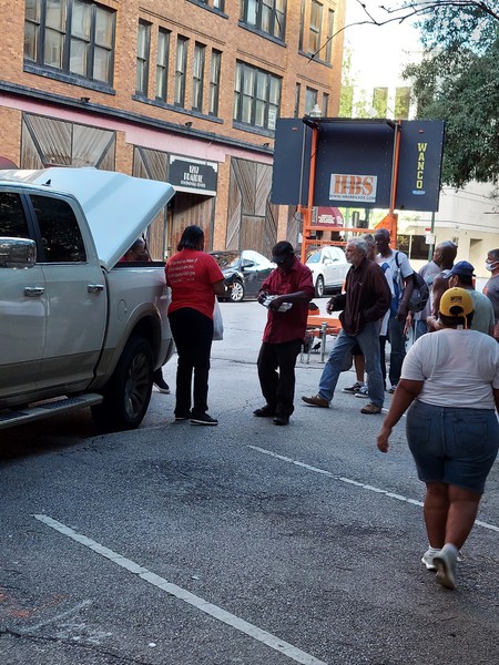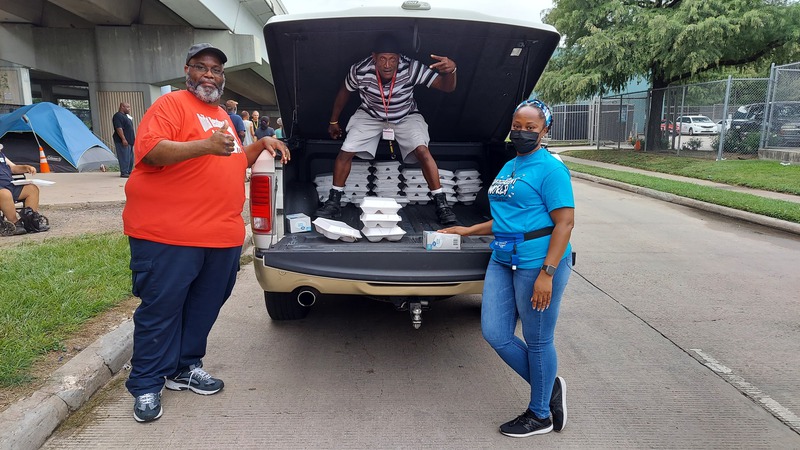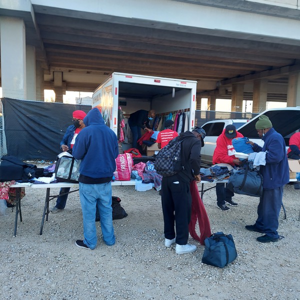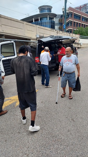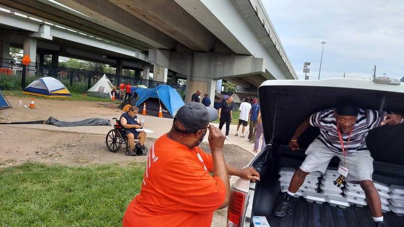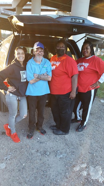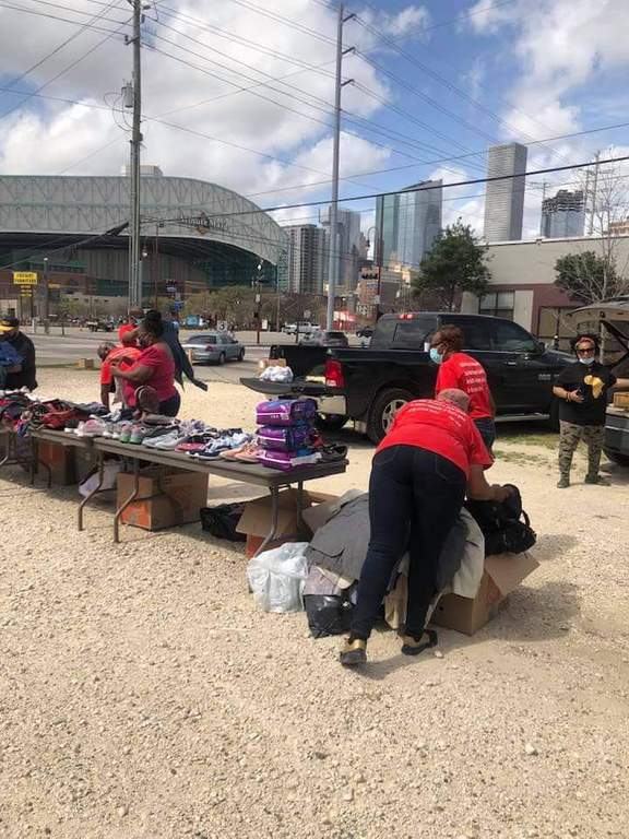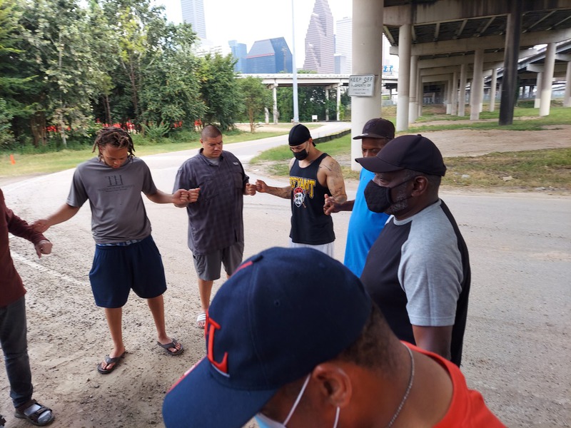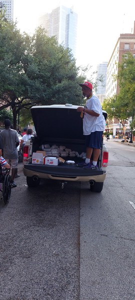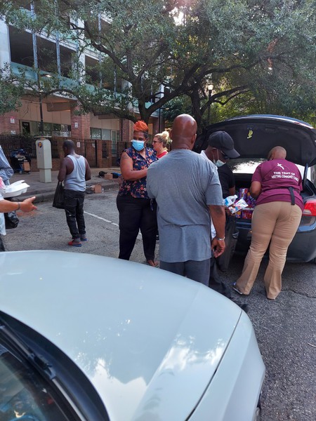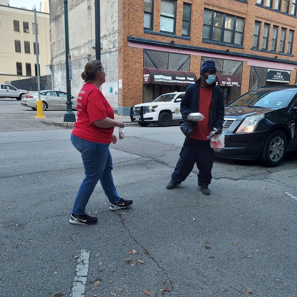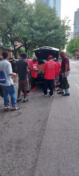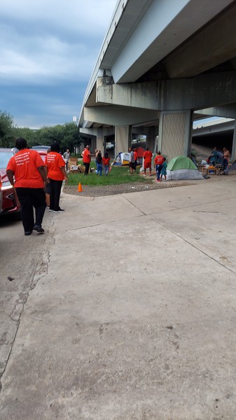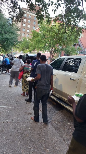 March 13, 2021 - Clothing and Food Drive Downtown Houston providing homemade meatloaf lunch to many.  God blessed many other ministeries to be on the same corner at the same time providing food and the Homeless Depot was providing mobile showers.  Felt just like a festival - True Ministry in Action!  Hallelejuiah.
