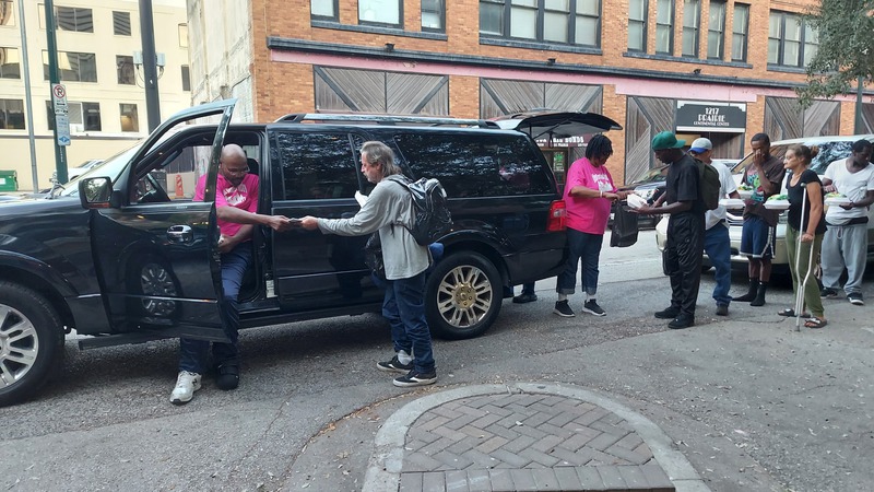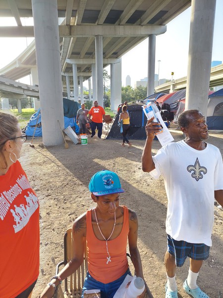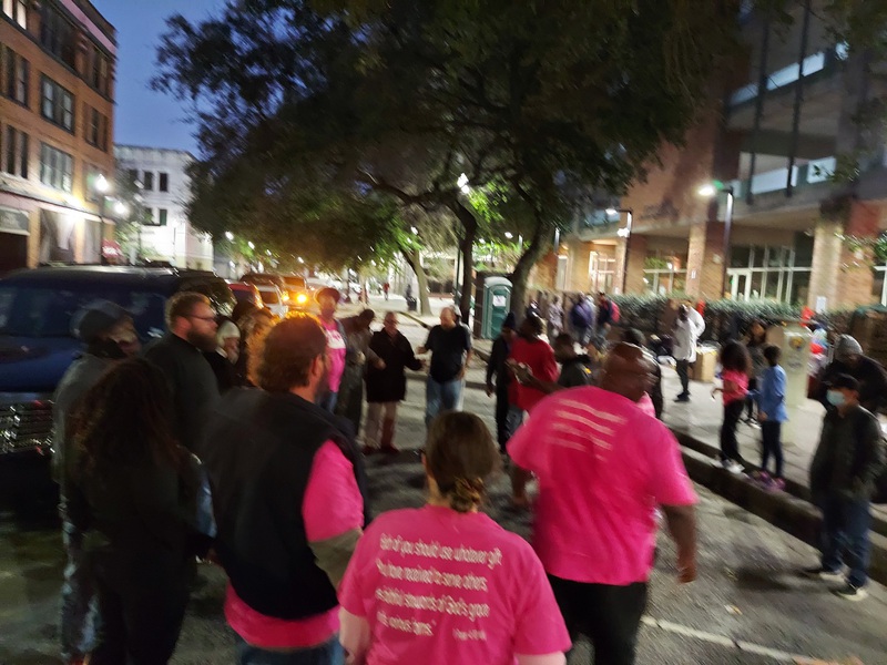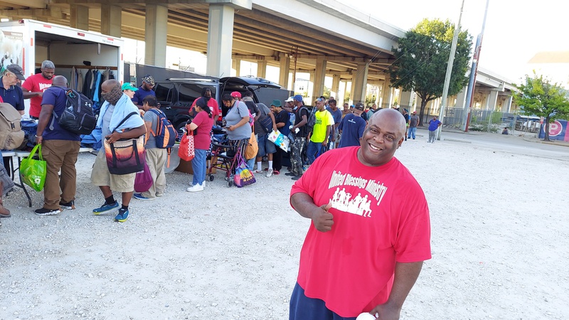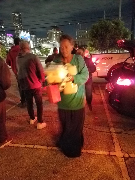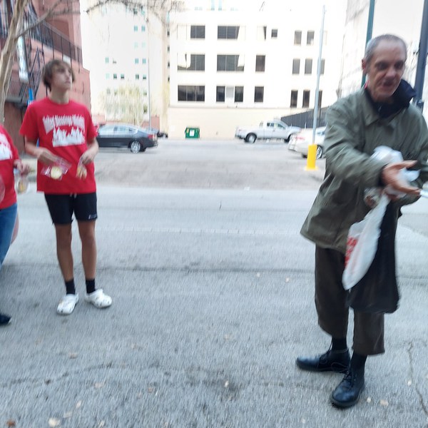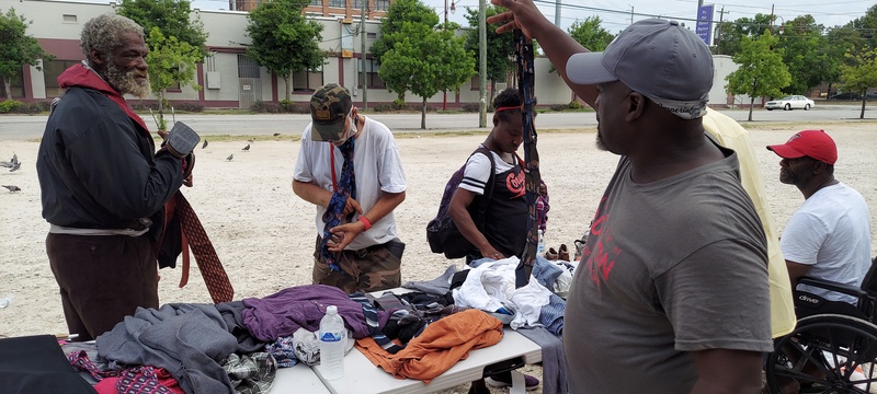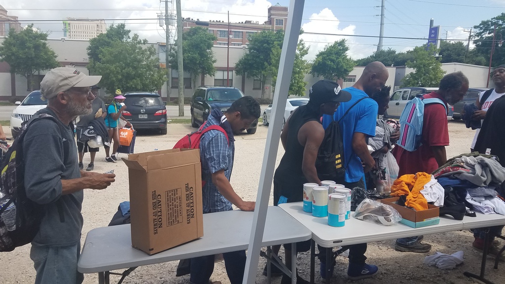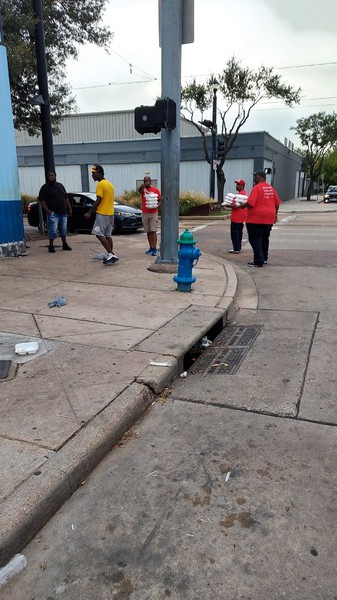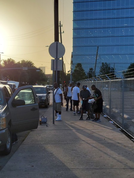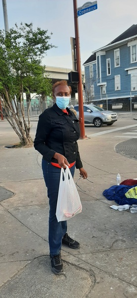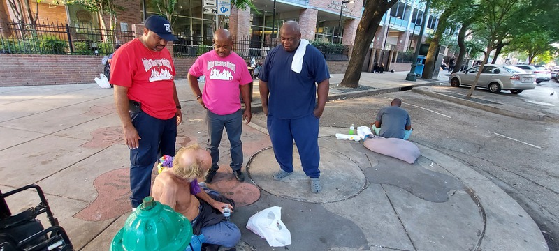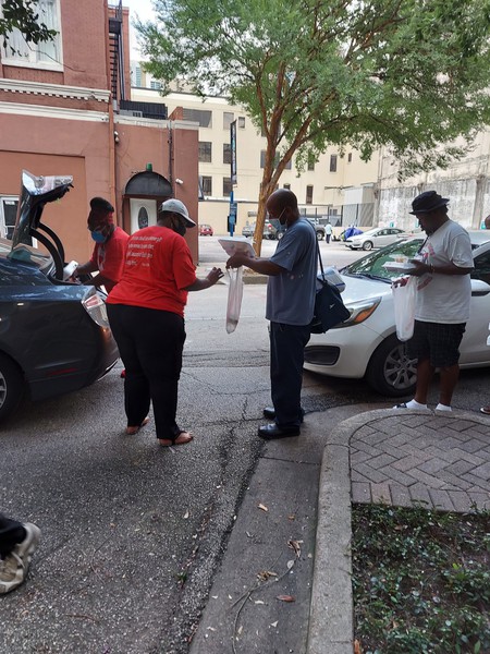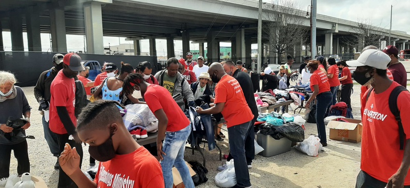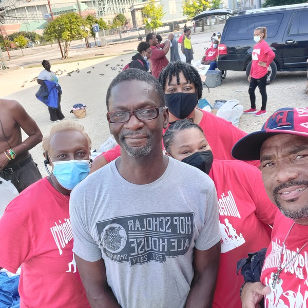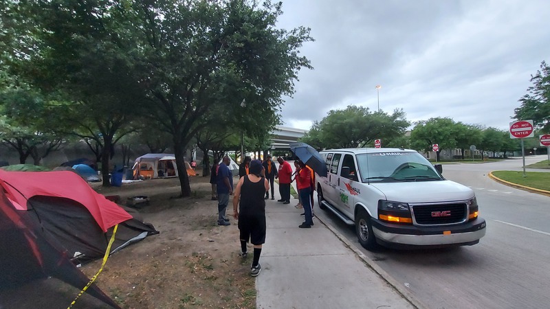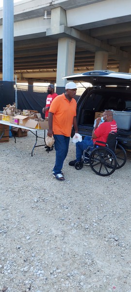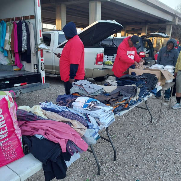 March 13, 2021 - Clothing and Food Drive Downtown Houston providing homemade meatloaf lunch to many.  God blessed many other ministeries to be on the same corner at the same time providing food and the Homeless Depot was providing mobile showers.  Felt just like a festival - True Ministry in Action!  Hallelejuiah.