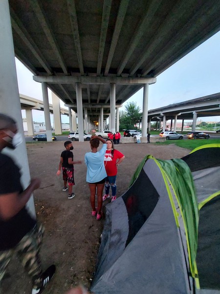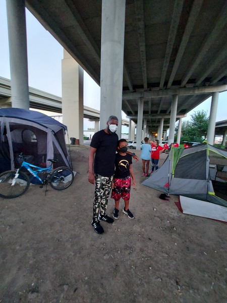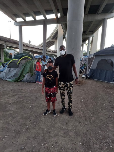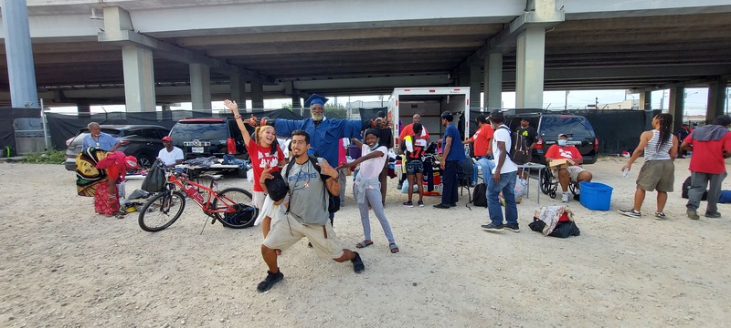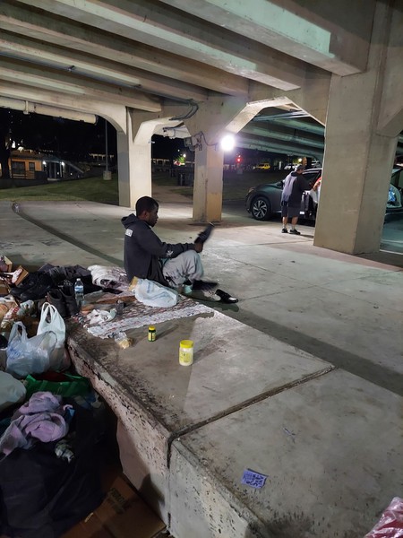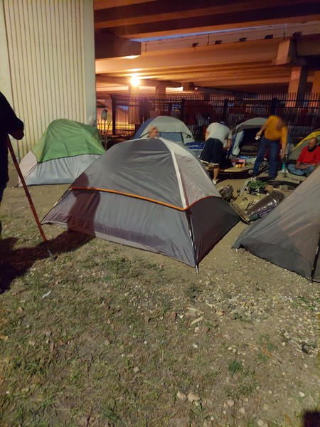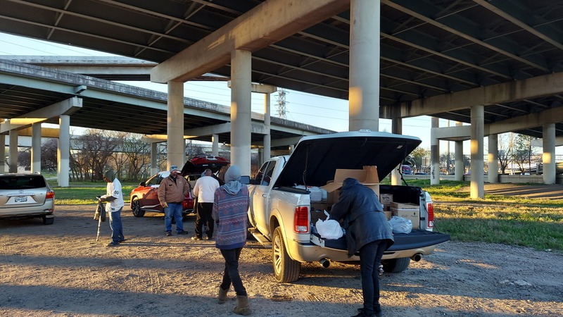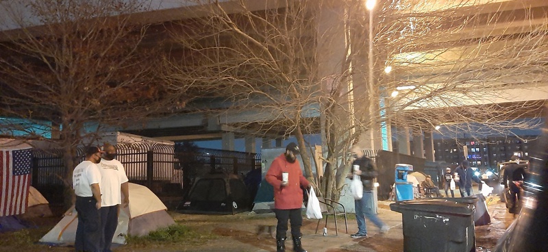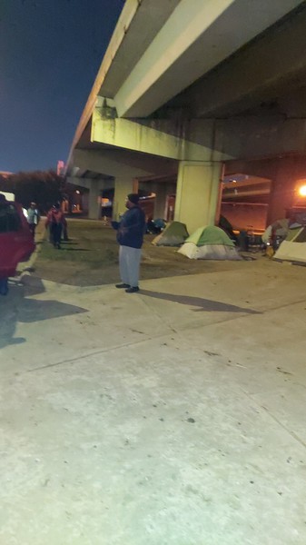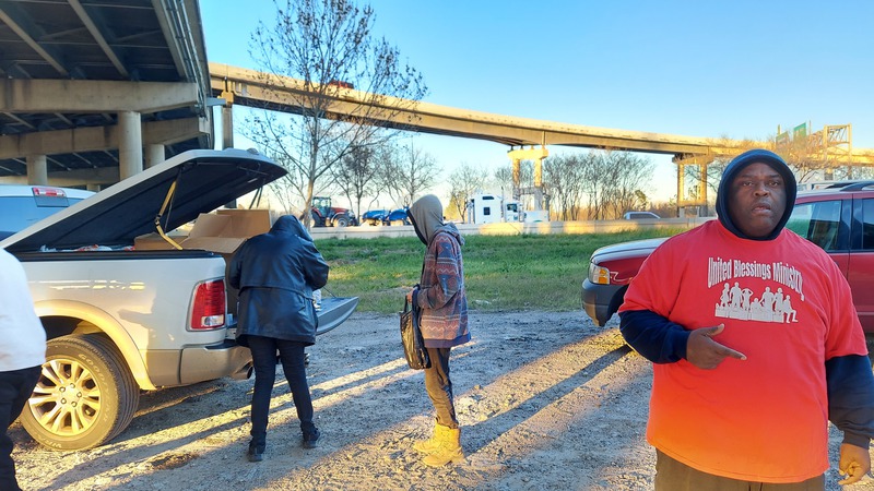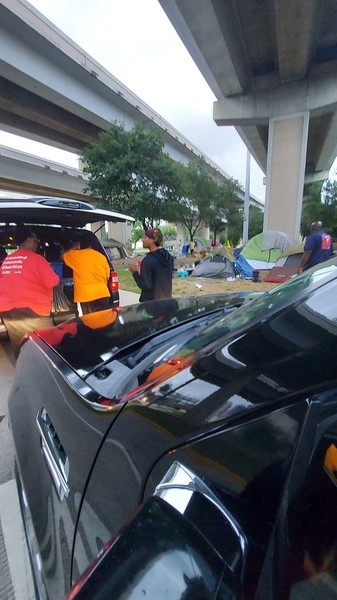 January 21, 2022 - It's cold in Houston so we blessed the community with homemade Chili & Beans, over a bed of rice with cornbread, cookies, milk, juice, water, toiletries and prayers.  The meal was provided by our church family in Navasota. One of our own told us about a new camp and we pulled up on them.  One of the guys said "you all are a homeless caravan bringing us everything we need".  They had a huge below ground fire pit they built to stay warm.  Simply amazing! Thank God that we are blessed to be a blessing to others.